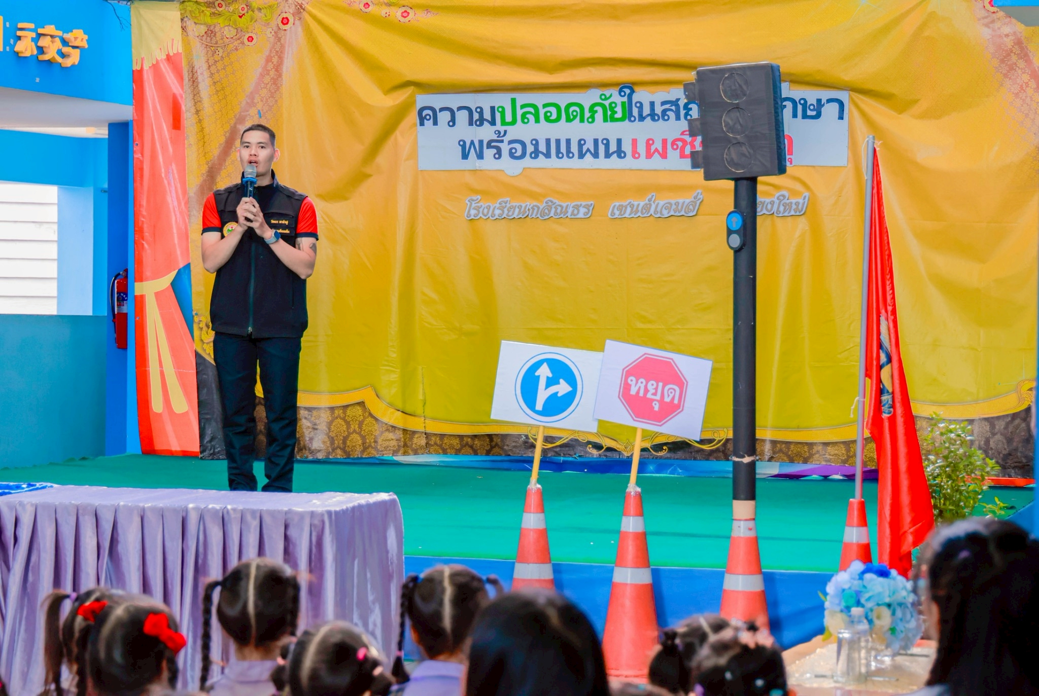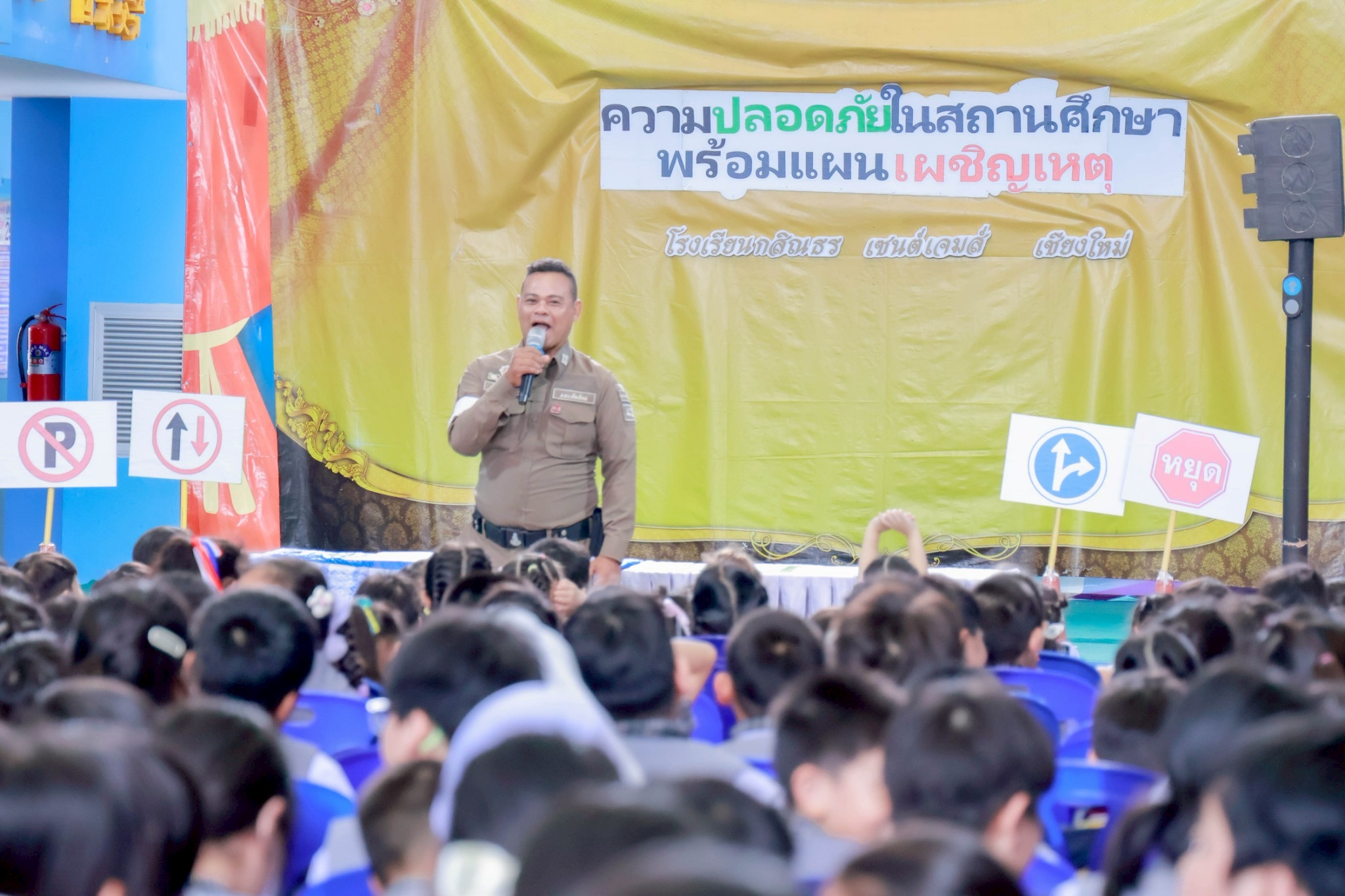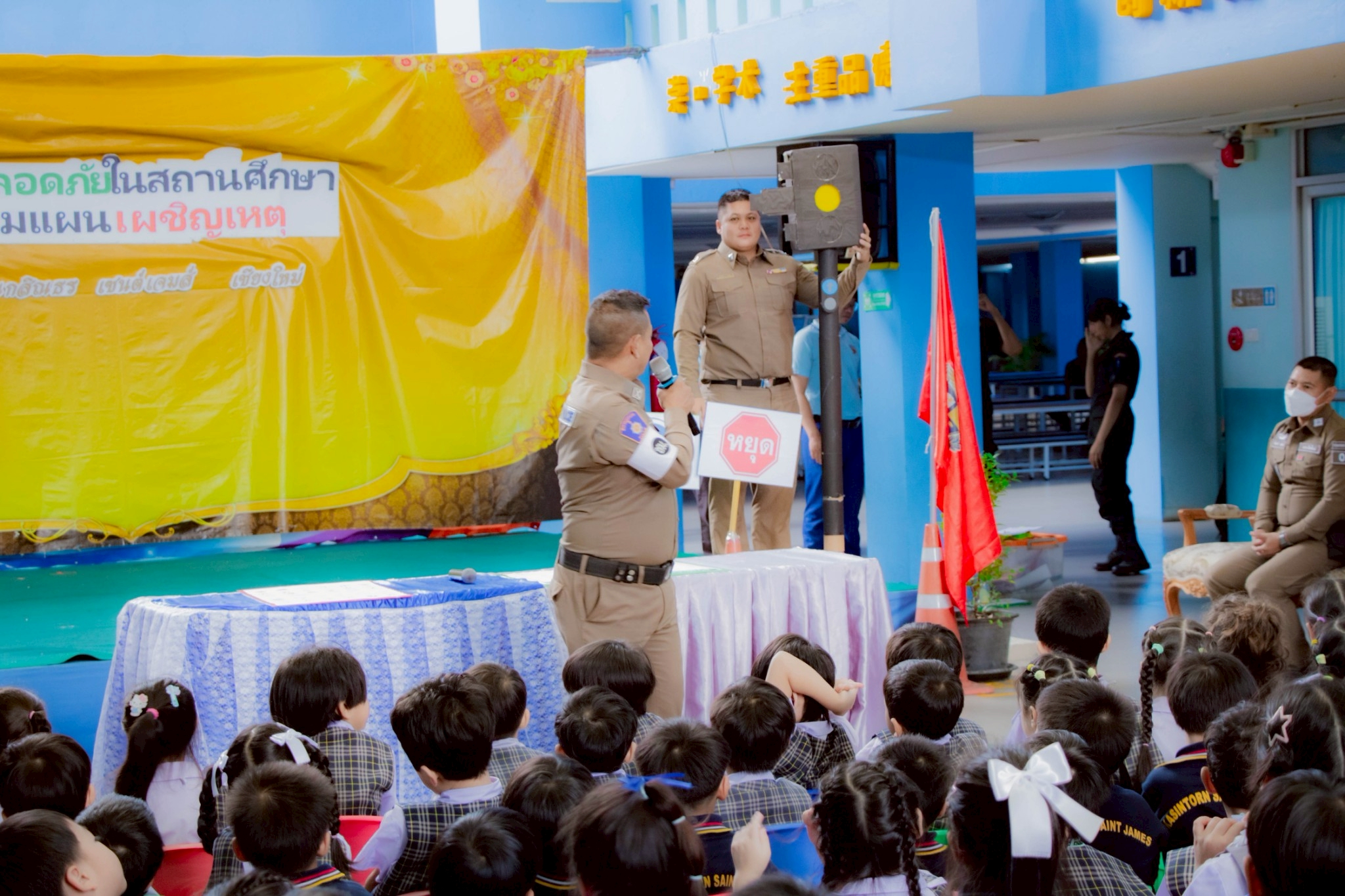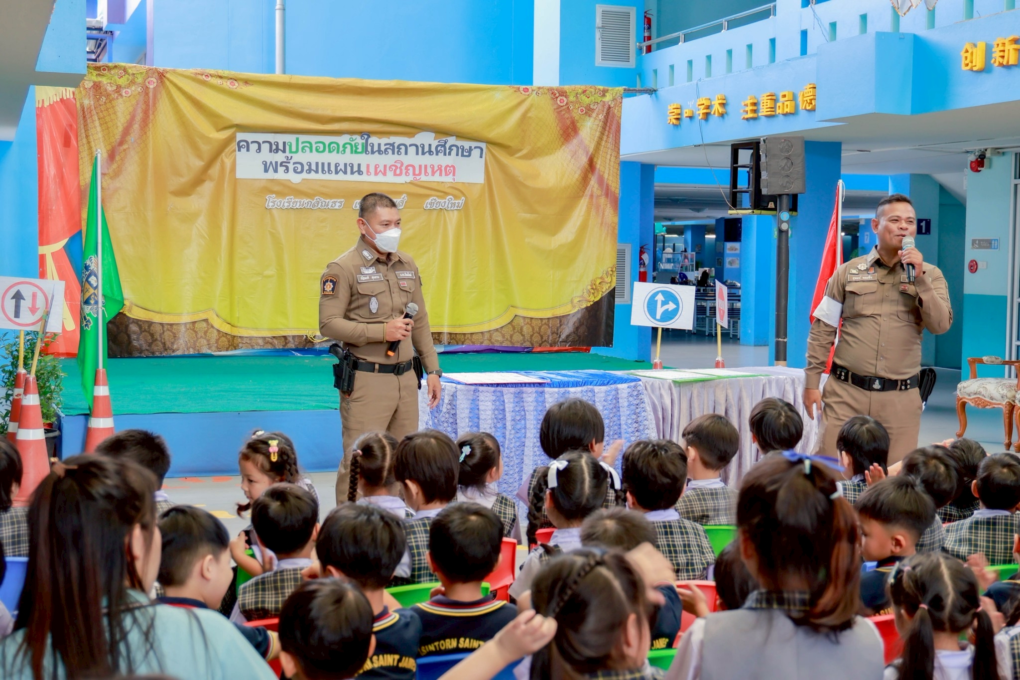 Kasintorn Saint James Chiang Mai School, in collaboration with the Pa Daet Subdistrict Municipality, the Chiang Mai Provincial Police Traffic Division, and the Honda Safe Driving Center Chiang Mai, has organized an emergency response drill. The objective is to educate students, teachers, and staff about the causes of accidents, equip them with basic prevention techniques using various tools and equipment, and familiarize them with safe evacuation routes from buildings during an emergency.🏃♀️