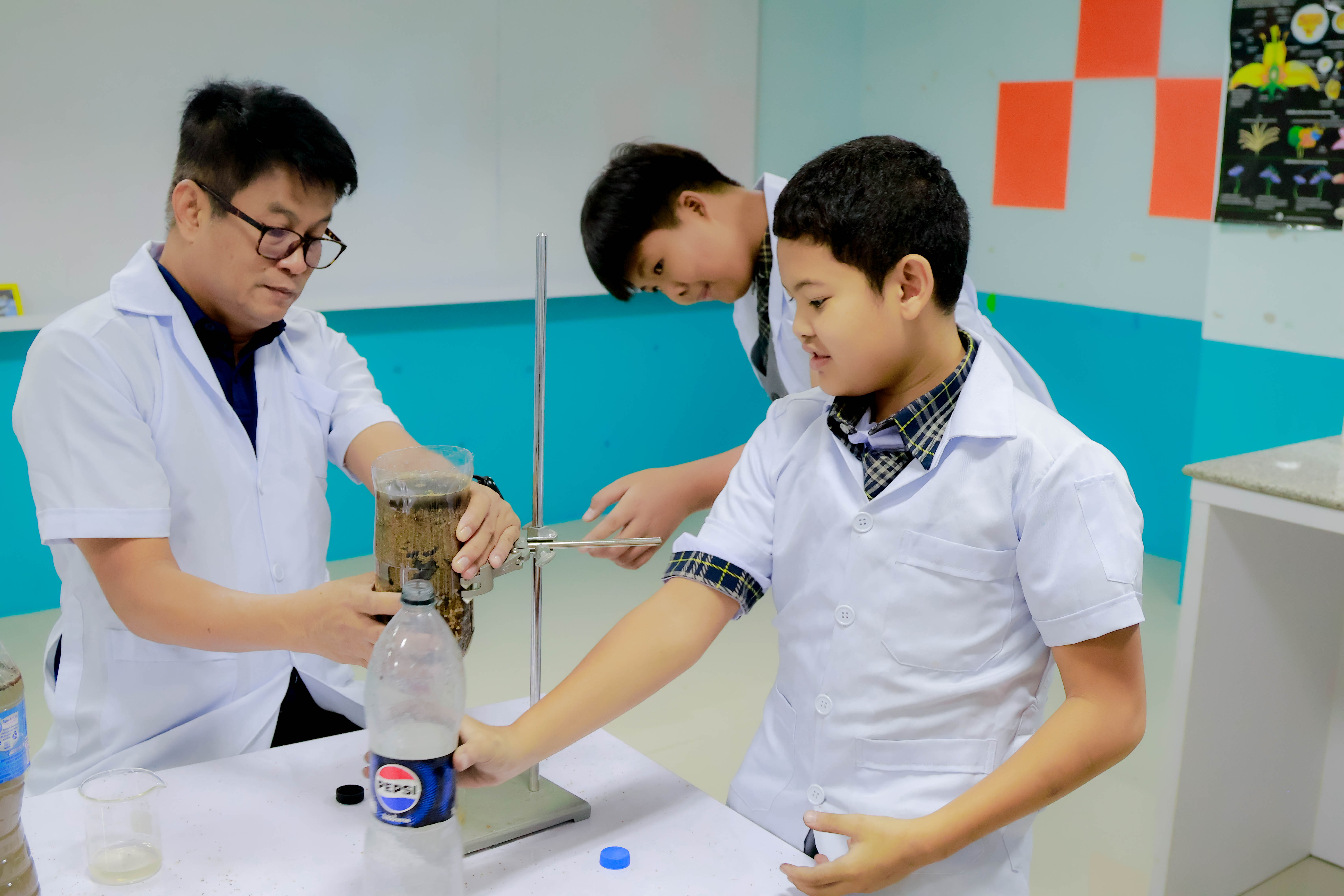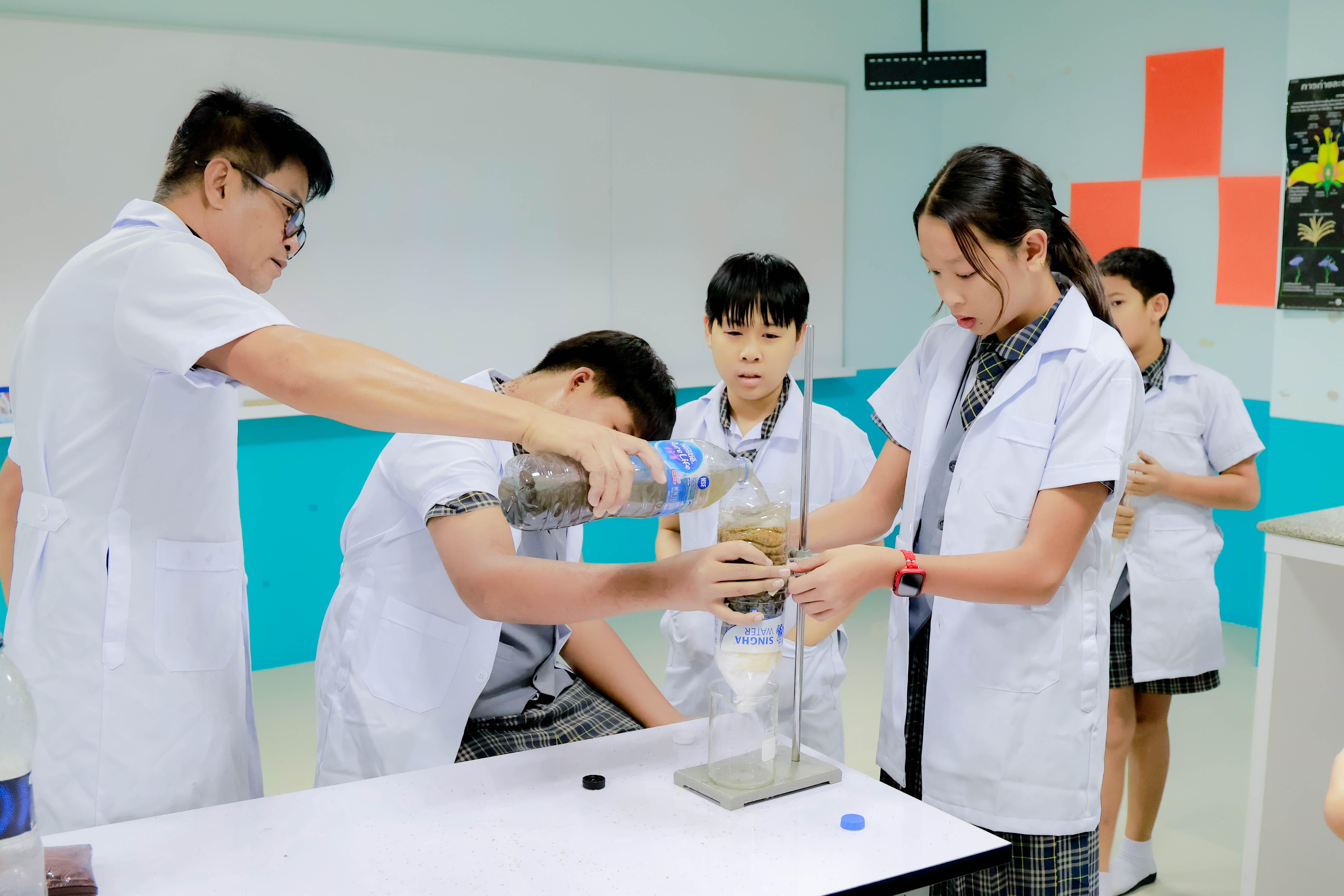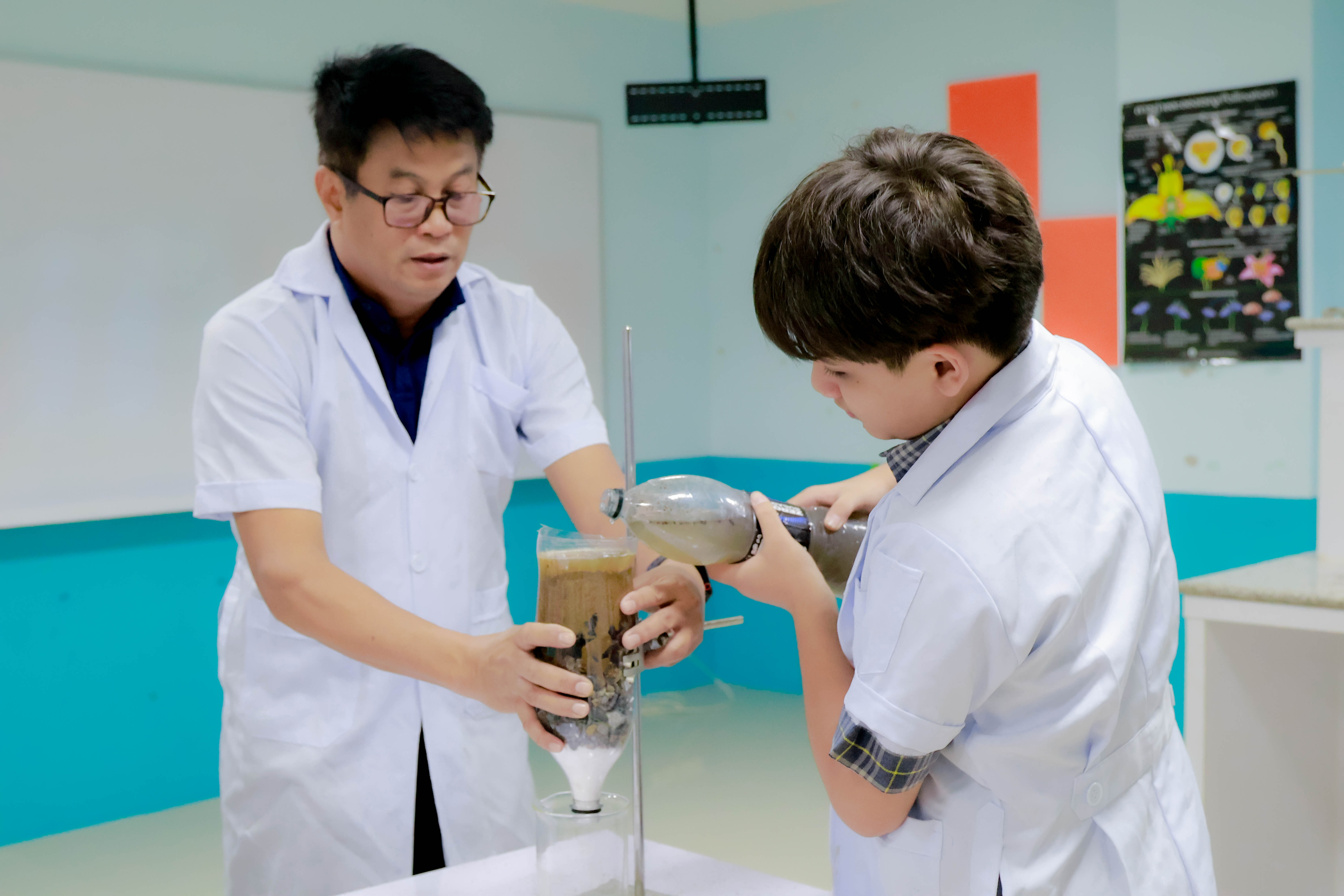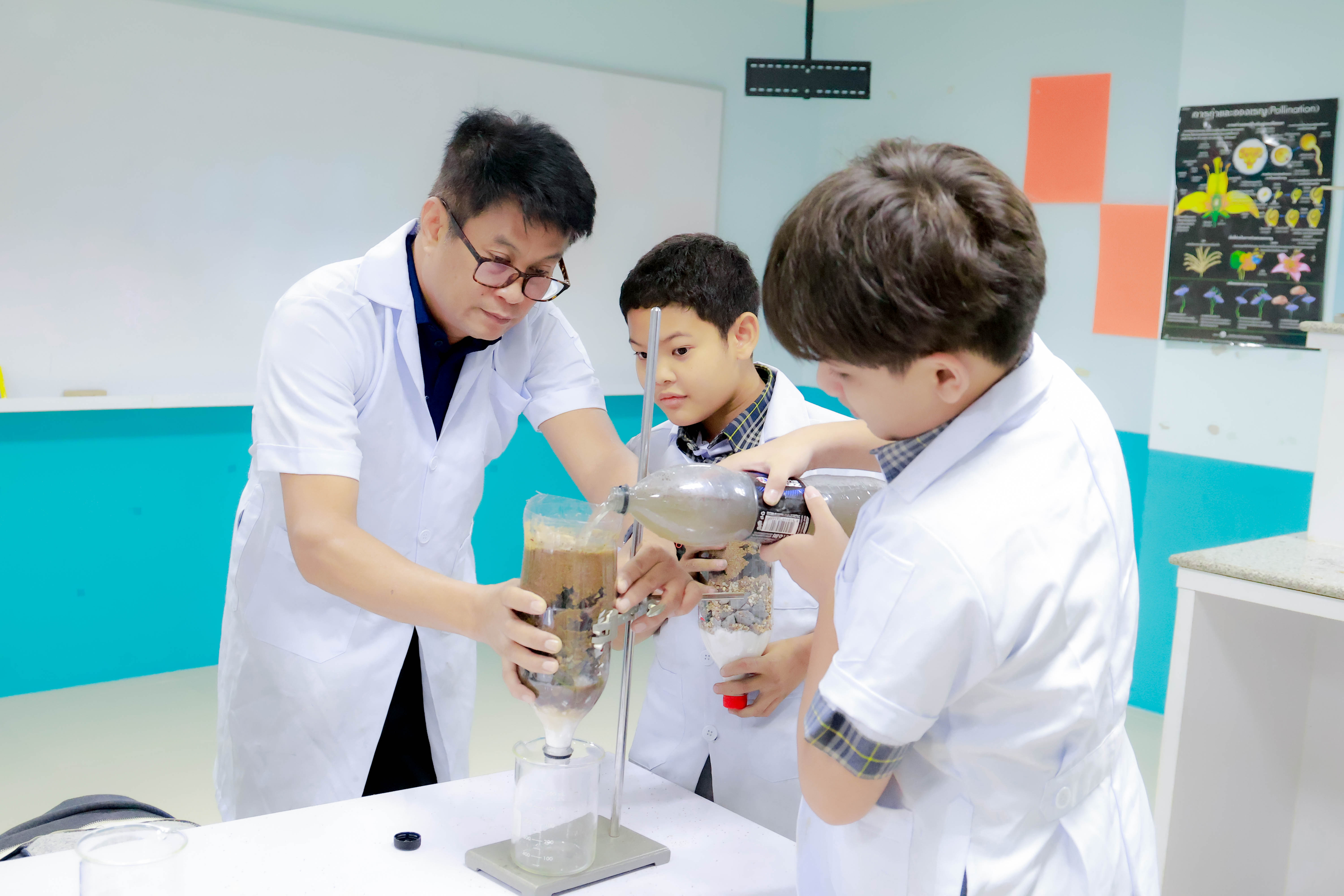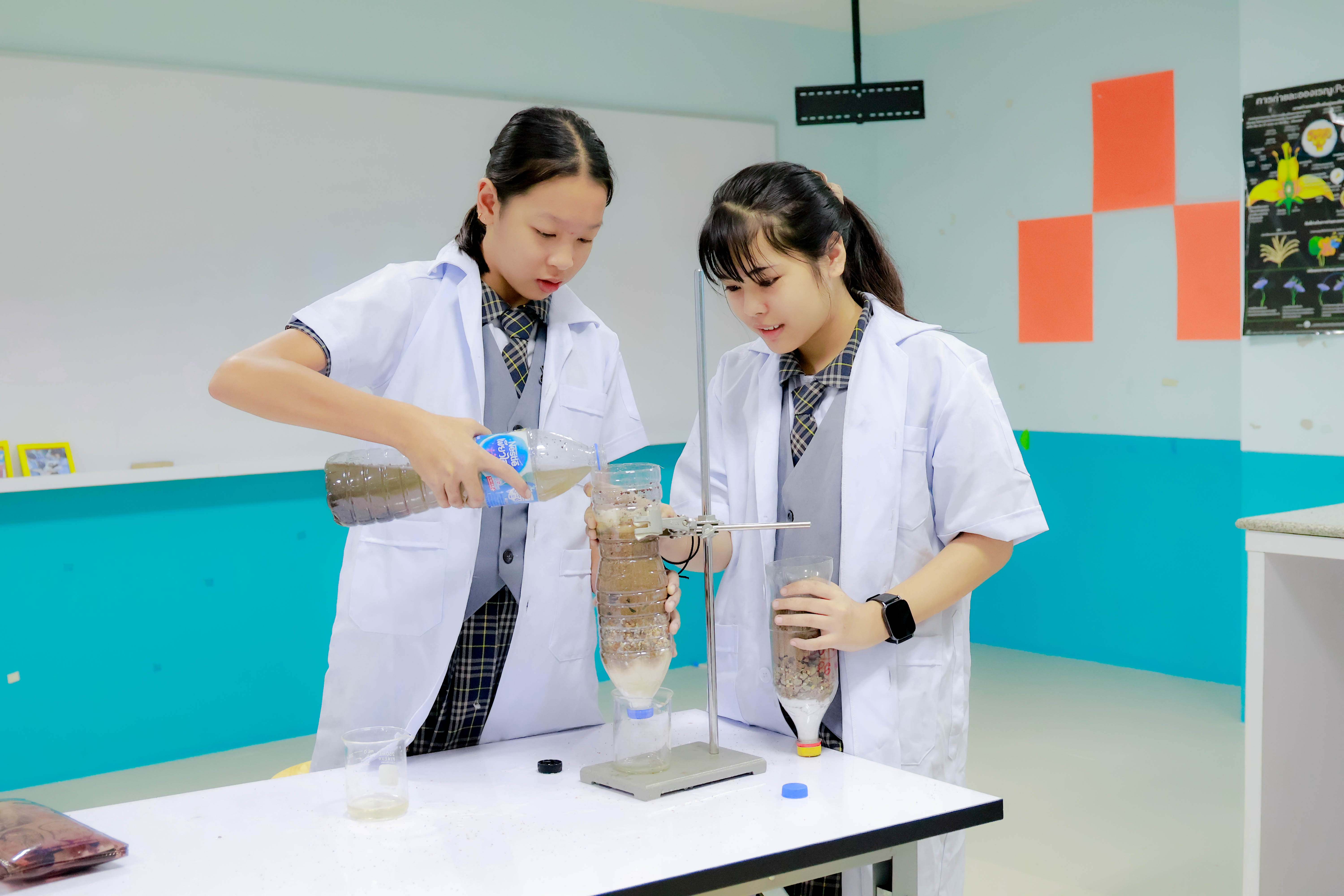 Students from Kasintorn Saint James School Chiang Mai, Grade 6, conducted an experiment on Separation of Mixtures using a simple filtration apparatus. Substances separated by filtration are mixtures of a solid mixed with a liquid or are used to separate suspensions from water, such as filtering canal water. The filtered canal water will become clean and can be used.