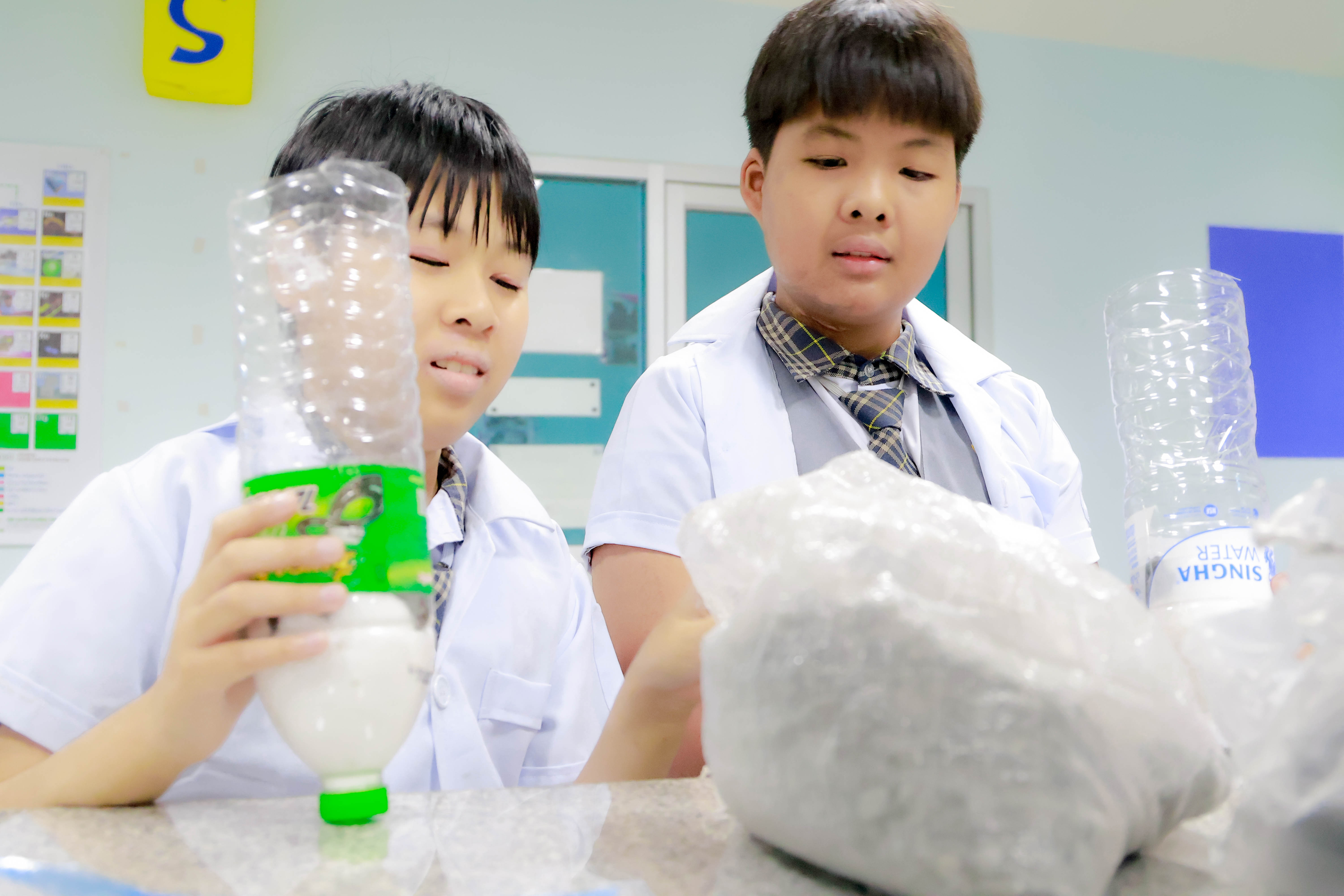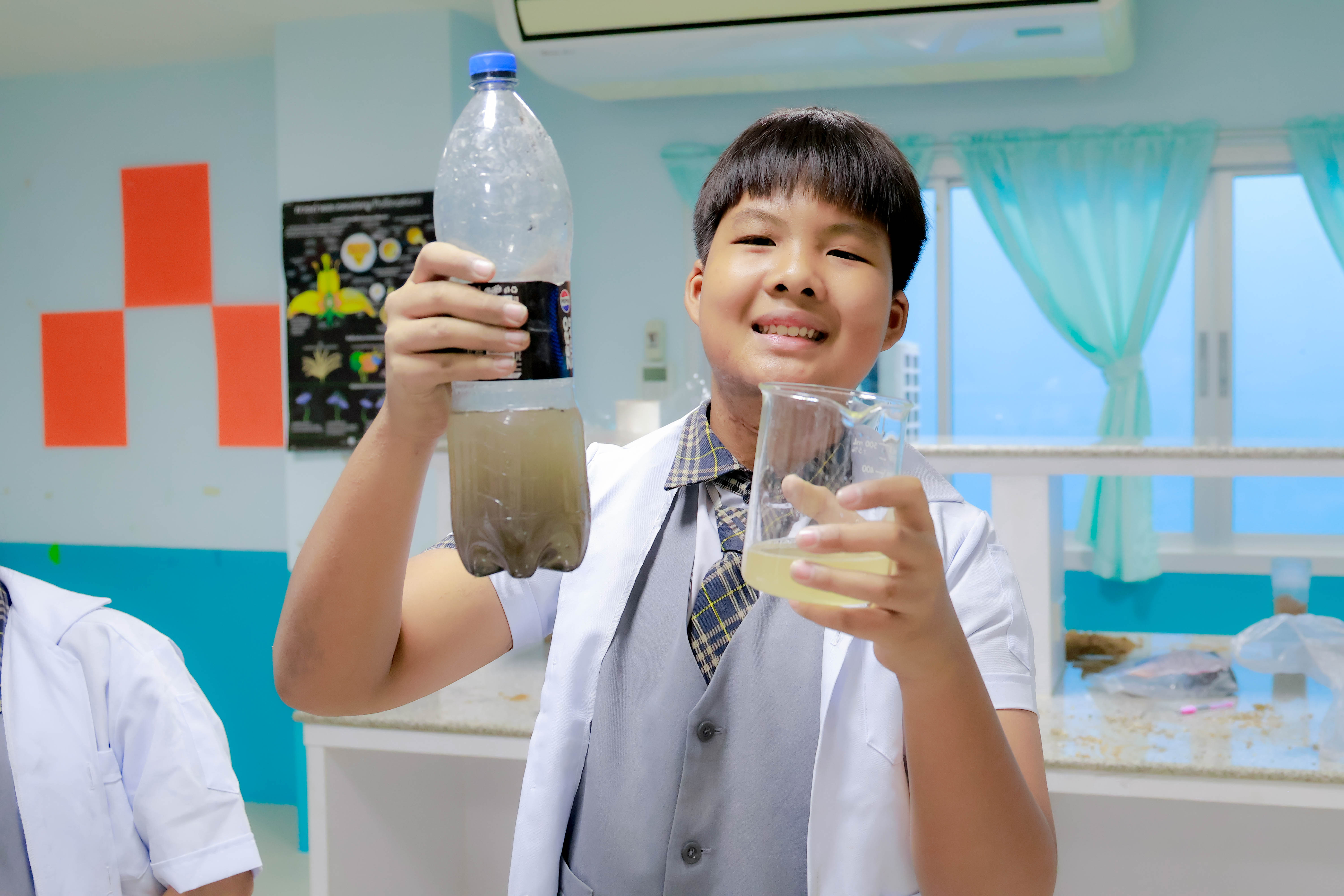 Students from Kasintorn Saint James School Chiang Mai, Grade 6, conducted an experiment on Separation of Mixtures using a simple filtration apparatus. Substances separated by filtration are mixtures of a solid mixed with a liquid or are used to separate suspensions from water, such as filtering canal water. The filtered canal water will become clean and can be used.